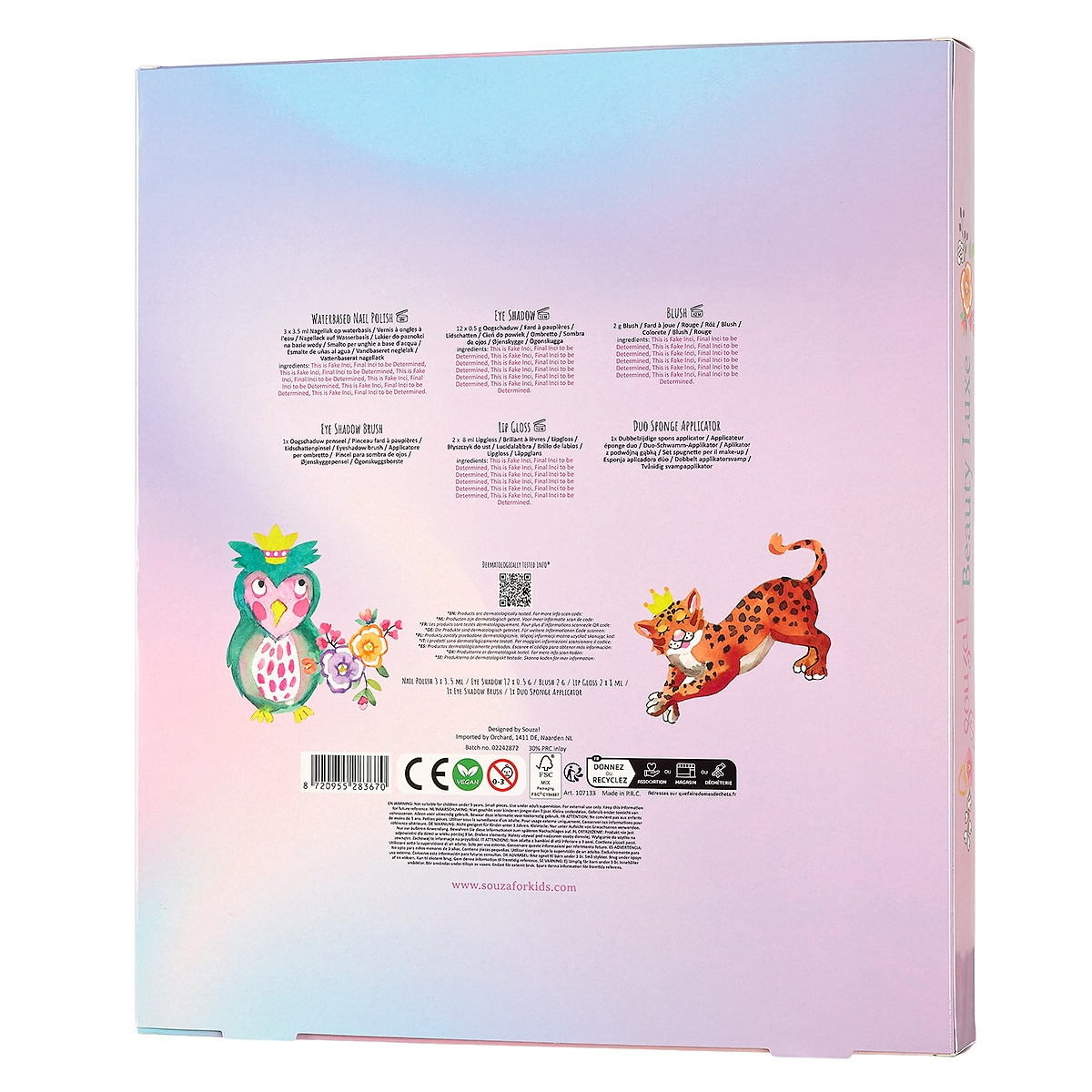 I cosmetici sono studiati per essere adatti ai bambini dai 6 anni in su, facili da rimuovere e pensati per non complicare la vita ai genitori: ombretti e lucidalabbra vanno via con acqua e sapone, mentre gli smalti si staccano come una pellicola. Perfetto per feste, compleanni o pomeriggi creativi a casa, è un set che mette insieme divertimento, colore e praticità.