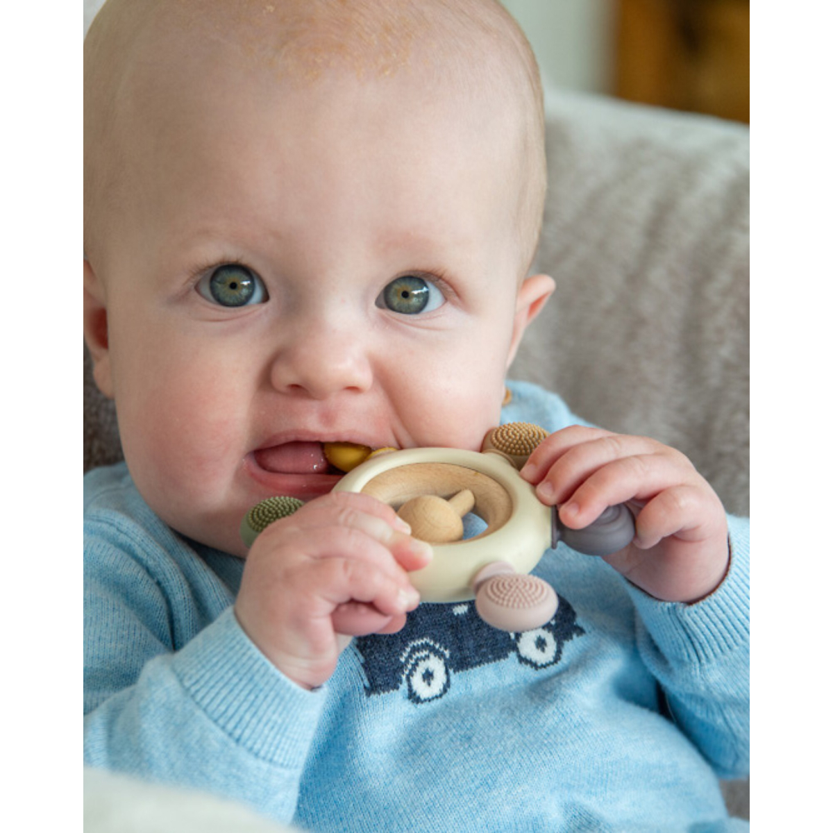 Un accessorio pensato per accompagnare i primi mesi di vita del bambino, quando esplorazione e dentizione si intrecciano. Il massaggiagengive con sonaglio Terra unisce silicone alimentare sicuro e legno di faggio naturale, offrendo un contrasto di texture che stimola la curiosità e lo sviluppo sensoriale. Il silicone morbido e testurizzato dona sollievo alle gengive doloranti, mentre l’anello centrale in legno crea un delicato sonaglio che cattura l’attenzione, incoraggiando coordinazione e gioco.