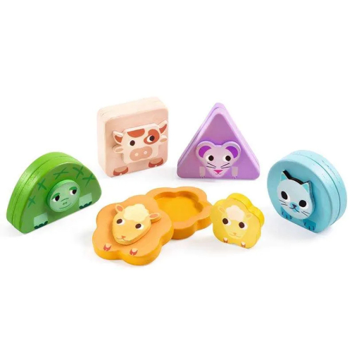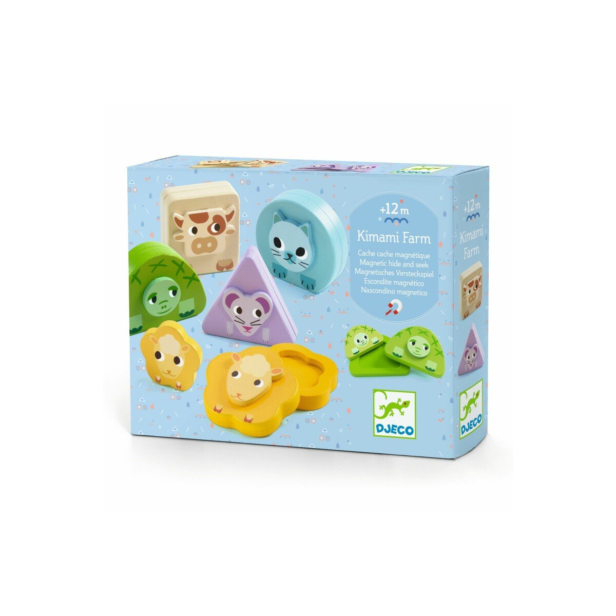 Kimami Farm Djeco è un originale gioco magnetico pensato per i più piccoli, a partire da 12 mesi. Al suo interno trovi 5 animali della fattoria, ciascuno composto da 3 parti che si aprono come un guscio. All’apertura, ogni animale rivela un cucciolo la cui forma geometrica corrisponde a quella del genitore: il bambino deve abbinare ogni cucciolo al suo genitore osservando le sagome. I magneti tengono le parti ben salde e favoriscono un gesto sicuro anche per mani piccole. Questo gioco unisce il piacere della scoperta con lo sviluppo cognitivo: il riconoscimento delle forme, la coordinazione occhio-mano e la memoria visiva. Il legno usato è certificato FSC e le finiture sono curate nei dettagli, offrendo un prodotto bello da vedere e piacevole da maneggiare.