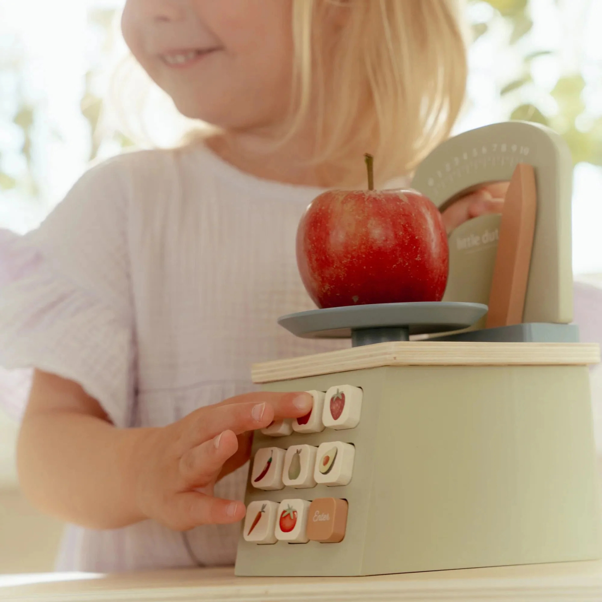 C’è chi pesa gli ingredienti per una torta vera e chi... per una torta di fantasia! Con questa bilancia da gioco in legno, ogni piccolo cuoco potrà sentirsi come un vero pasticcere. Realizzata in legno resistente e curata nei dettagli, è pensata per accompagnare le avventure culinarie dei bambini in tutta sicurezza. Basta posizionare i “prodotti” sul piatto e guardare l’ago muoversi: un gesto semplice ma incredibilmente realistico, che stimola la manualità e la curiosità.