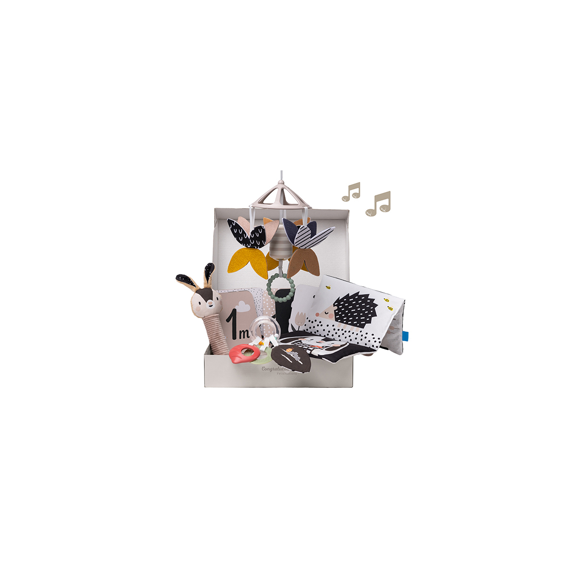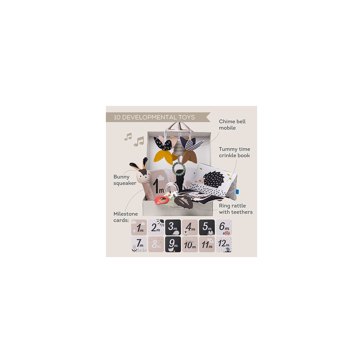 - Contiene 10 giochi sensoriali: libro crinkle bianco e nero, anello gioco con massaggiagengive e foglia frusciante, mobile con campanellino, squeaker a forma di coniglio, 6 cards mensili fronte retro,