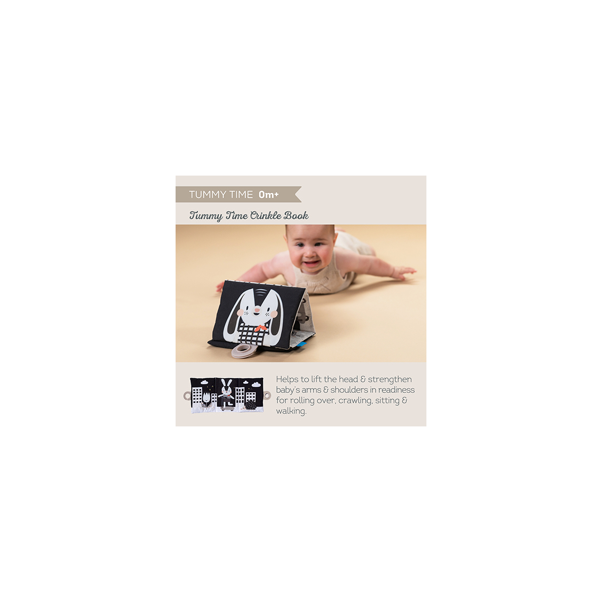 Il libro crinkle è perfetto per il tummy time, il sonaglio ad anello con massaggiagengive sostiene l’esplorazione manuale, il pendente con campanellino offre stimoli visivi e uditivi, e lo squeaker a forma di coniglietto introduce il bambino al concetto di causa ed effetto.