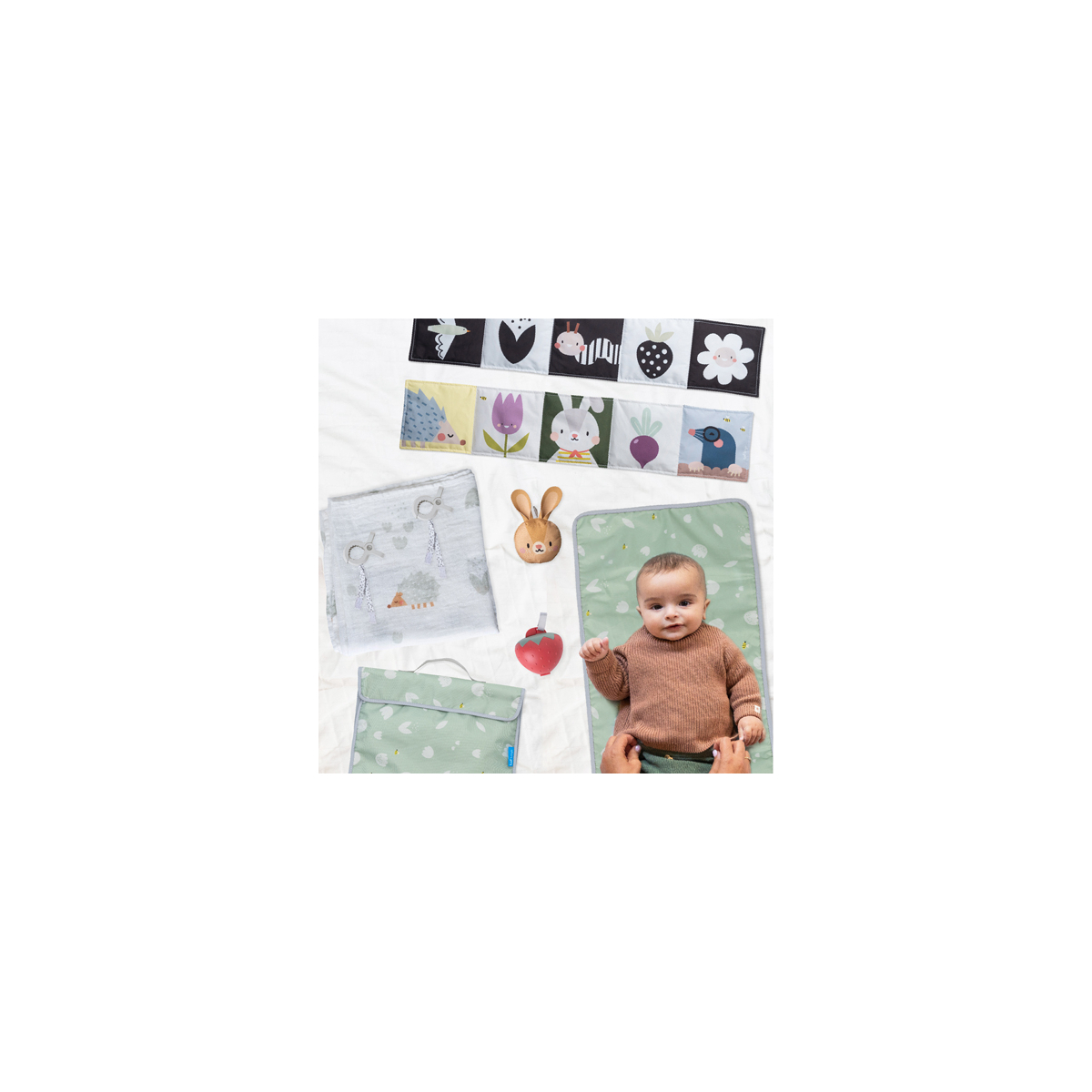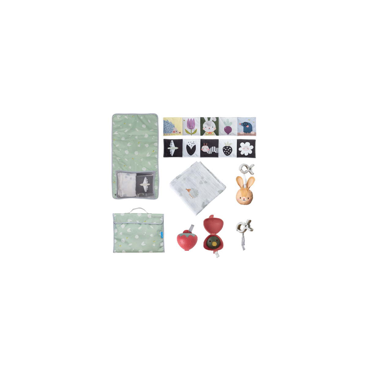 Racchiude tutto ciò che serve per rendere le uscite più semplici, organizzate e confortevoli: una mussola grande e leggera, un fasciatoio da viaggio che si richiude in una pratica borsa, due clip versatili, un porta ciuccio a forma di fragola, un sonaglino coniglietto e un libricino da passeggino fronte retro.