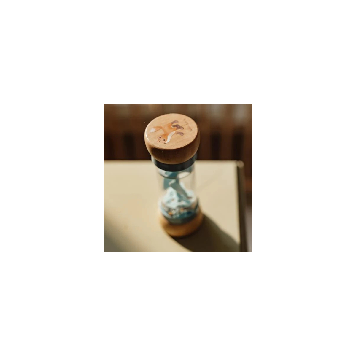 Durante il movimento, le palline attraversano piccole aperture facendo girare un’elica interna: un dettaglio semplice ma affascinante, che stimola la vista e la coordinazione occhio-mano. La forma è studiata per le mani piccole, facile da afferrare e maneggiare in autonomia. Le estremità in legno sono decorate con illustrazioni ispirate al mondo del bosco, trasformando questo sonaglio in un piccolo strumento musicale e sensoriale, perfetto per accompagnare le prime esplorazioni sonore.