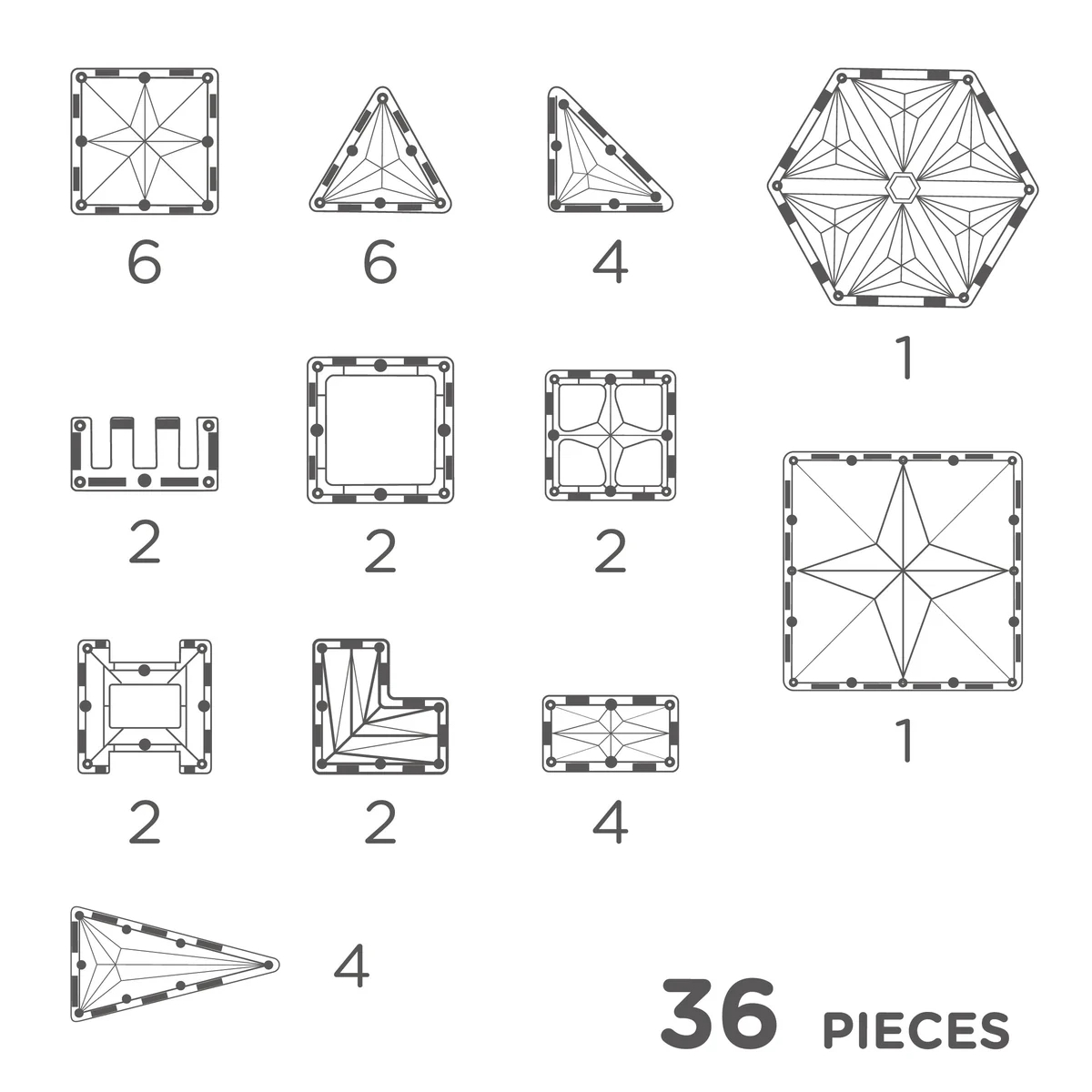 - Contenuto: 6 quadrati piccoli, 1 quadrato grande, 6 triangoli equilateri, 4 triangoli isosceli, 4 triangoli rettangoli, 4 rettangoli, 1 esagono, 2 forme dentellate, 2 quadrati aperti, 2 recinzioni, 2 forme a L.