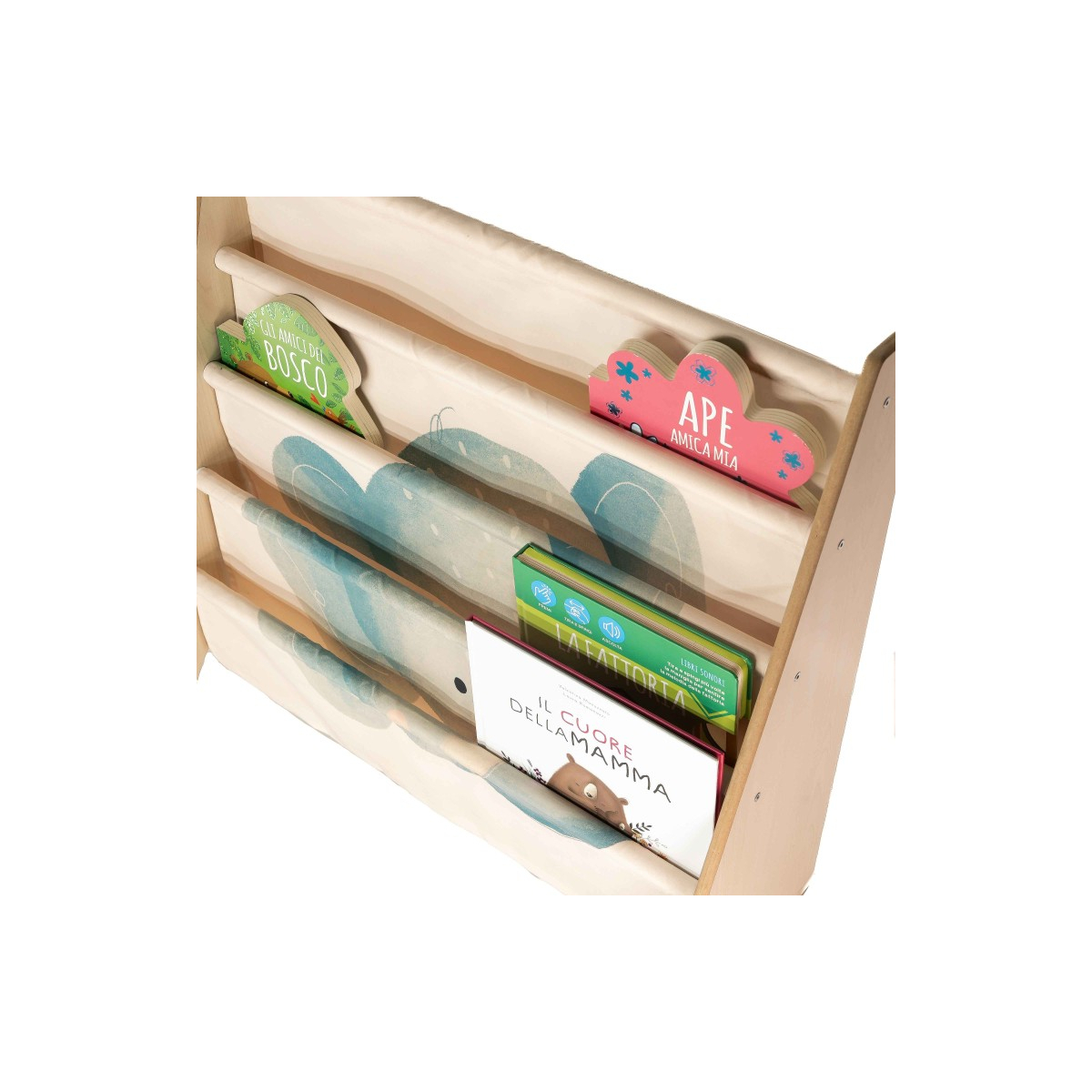 Le copertine dei libri restano ben visibili e a portata di mano, rendendo più semplice per i bambini individuare e scegliere la loro storia preferita. Le decorazioni con simpatici animali aggiungono un tocco giocoso alla cameretta o allo spazio lettura, trasformando la libreria in un angolo accogliente dedicato ai libri.