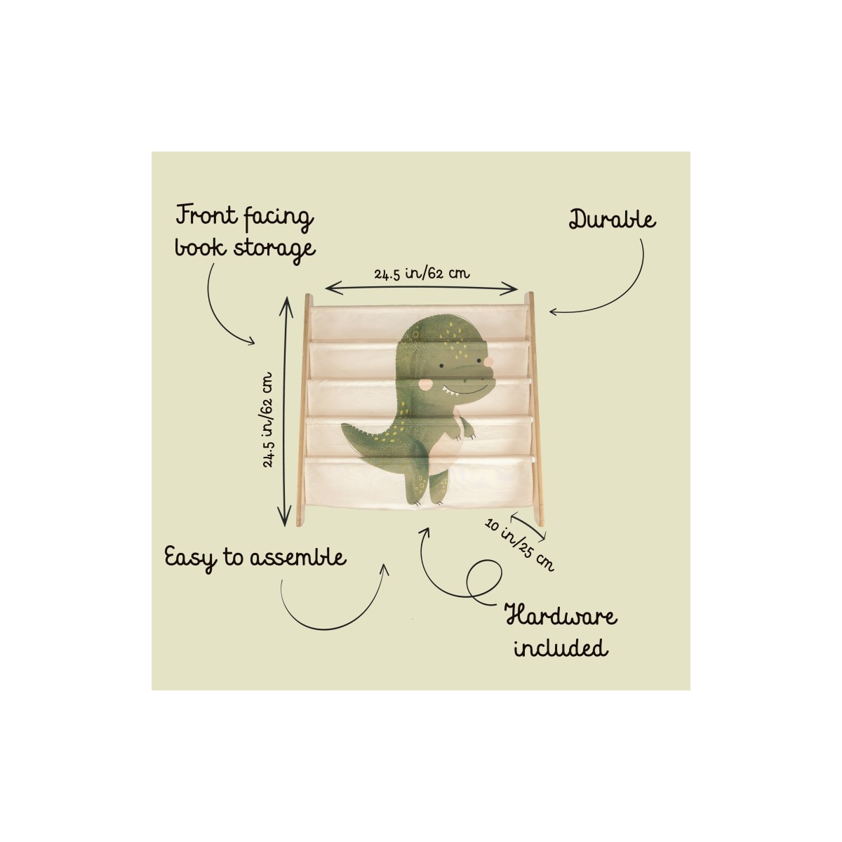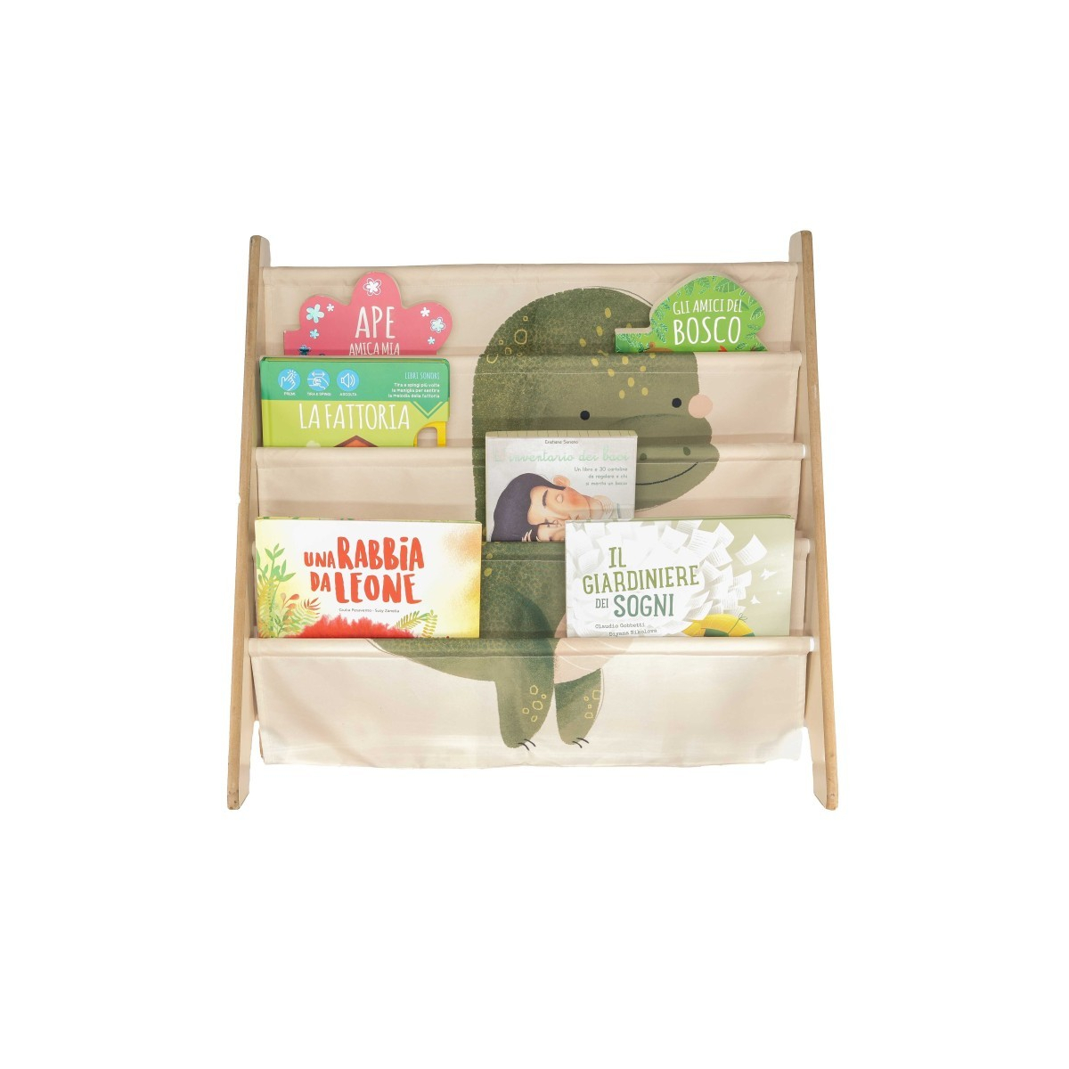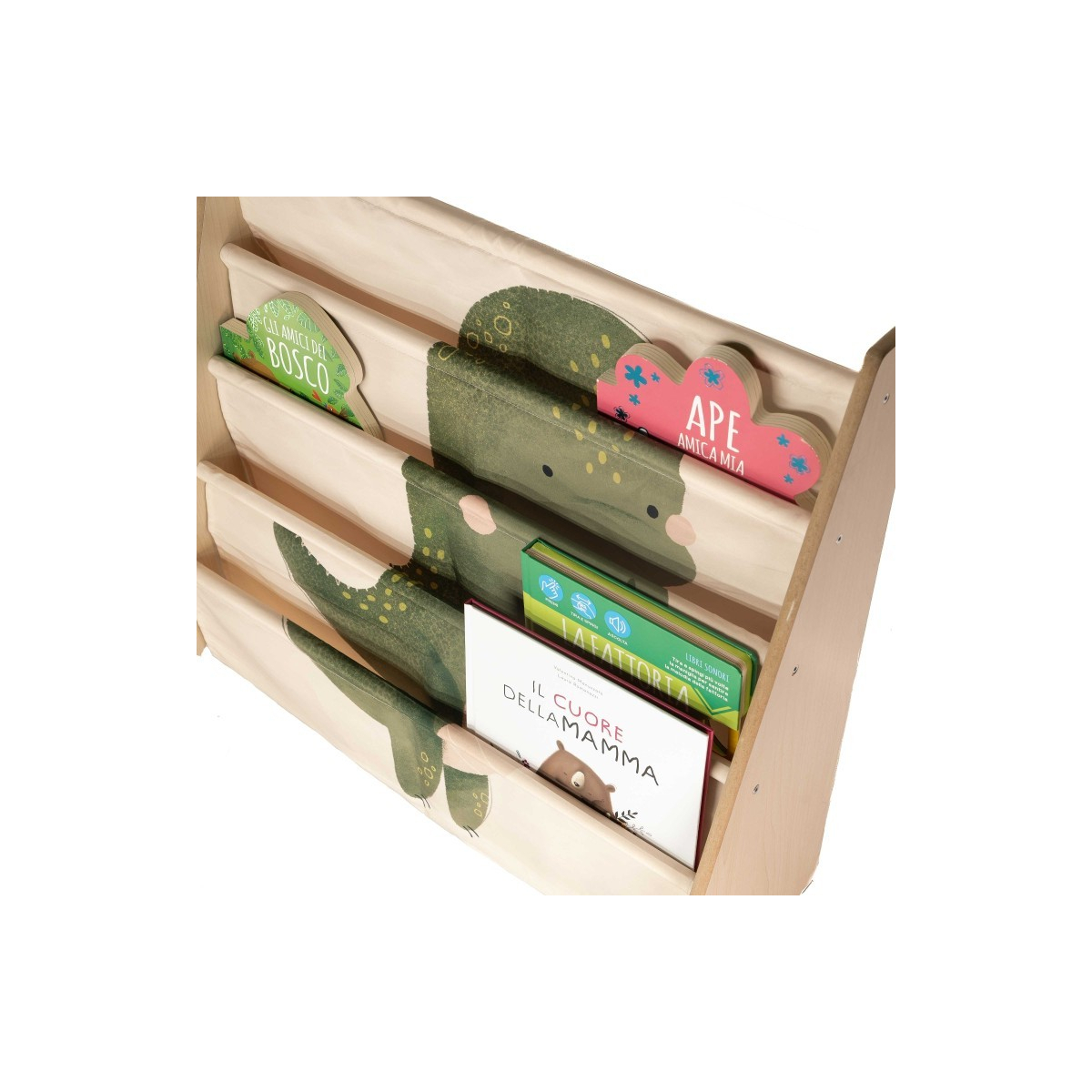 Le copertine dei libri restano ben visibili e a portata di mano, rendendo più semplice per i bambini individuare e scegliere la loro storia preferita. Le decorazioni con simpatici animali aggiungono un tocco giocoso alla cameretta o allo spazio lettura, trasformando la libreria in un angolo accogliente dedicato ai libri.