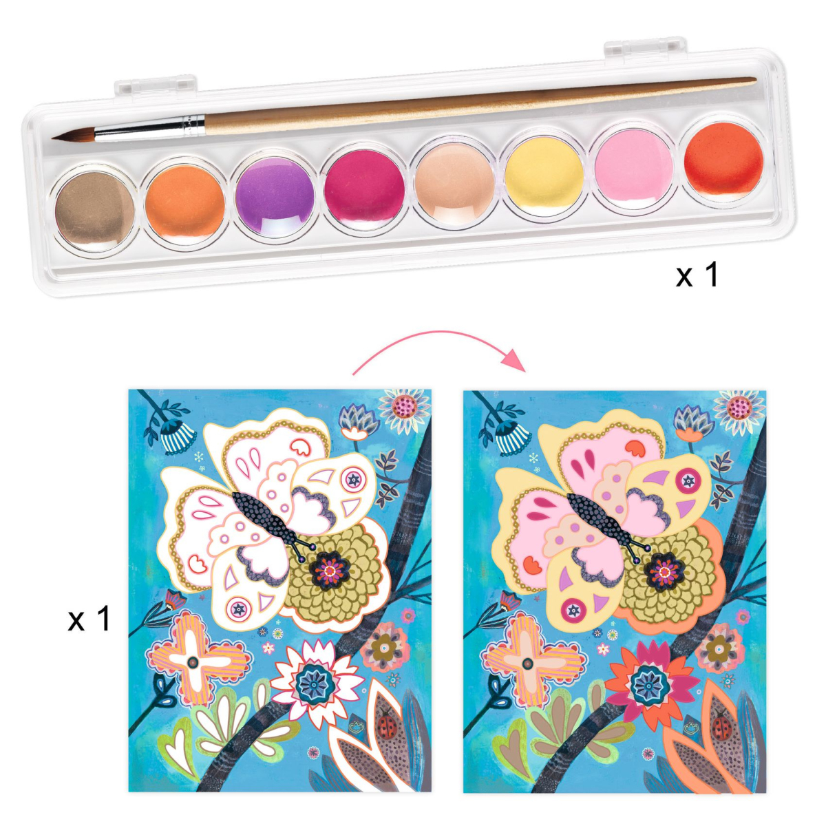 - Pittura: 1 tavola da dipingere (21 × 29,7 cm), 1 palette con 8 colori a tempera e 1 pennello.