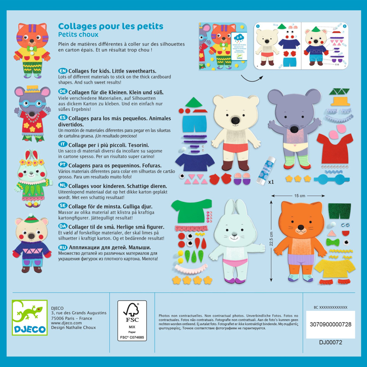 Un kit di collage completo per decorare 4 dolci personaggi sagomati utilizzando tanti materiali diversi: feltro, gommapiuma, lustrini, nastri, pompon e occhi mobili. I bambini scelgono il loro personaggio preferito e lo arricchiscono incollando gli elementi decorativi, dando vita a creazioni tenerissime e tutte da personalizzare.