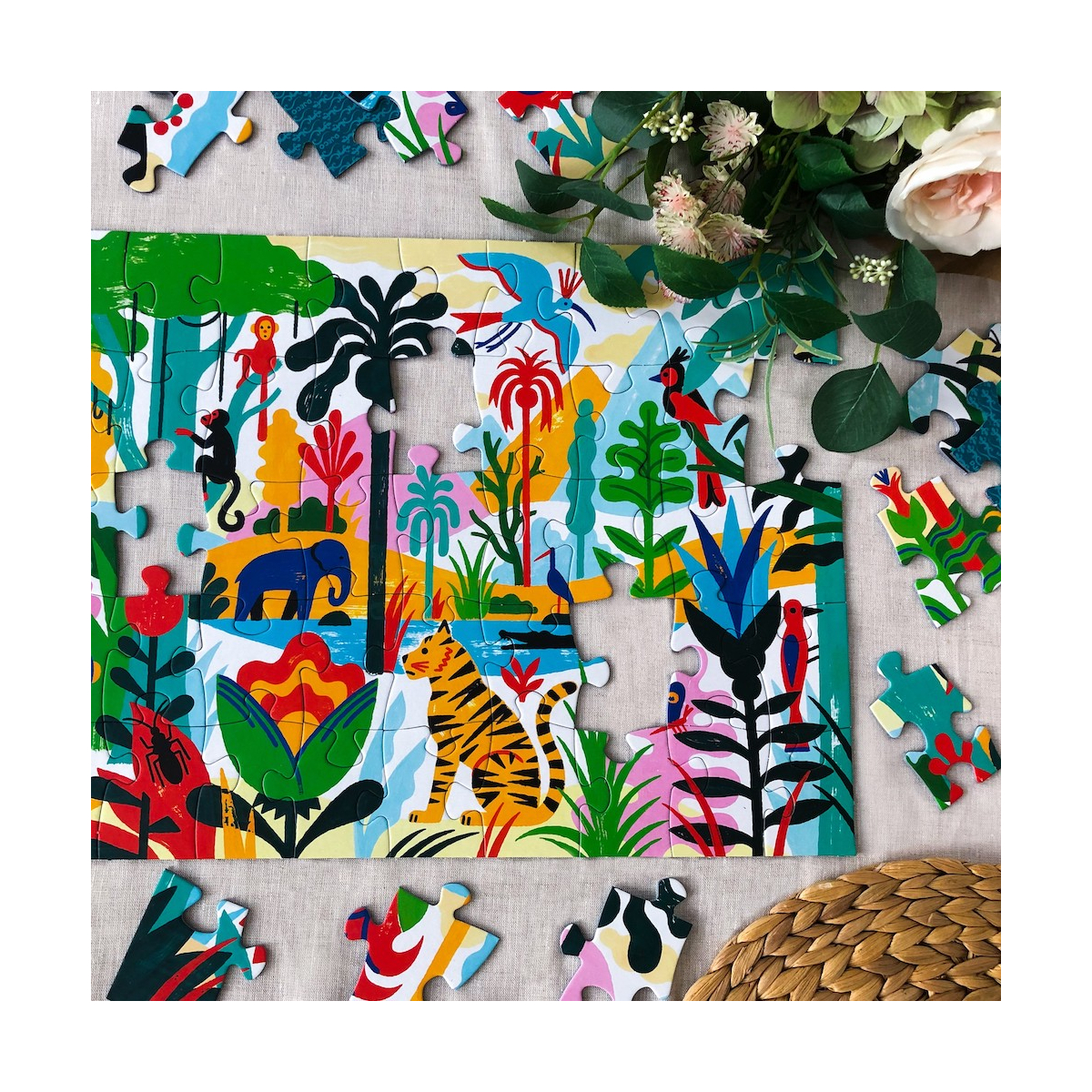 Jungle è un puzzle gallery da 100 pezzi che immerge i bambini nella flora e fauna coloratissima della giungla. In questo formato inedito, tutto in lunghezza, l’illustrazione si estende come un grande racconto visivo, ricco di dettagli, animali e sorprese da scoprire tessera dopo tessera.