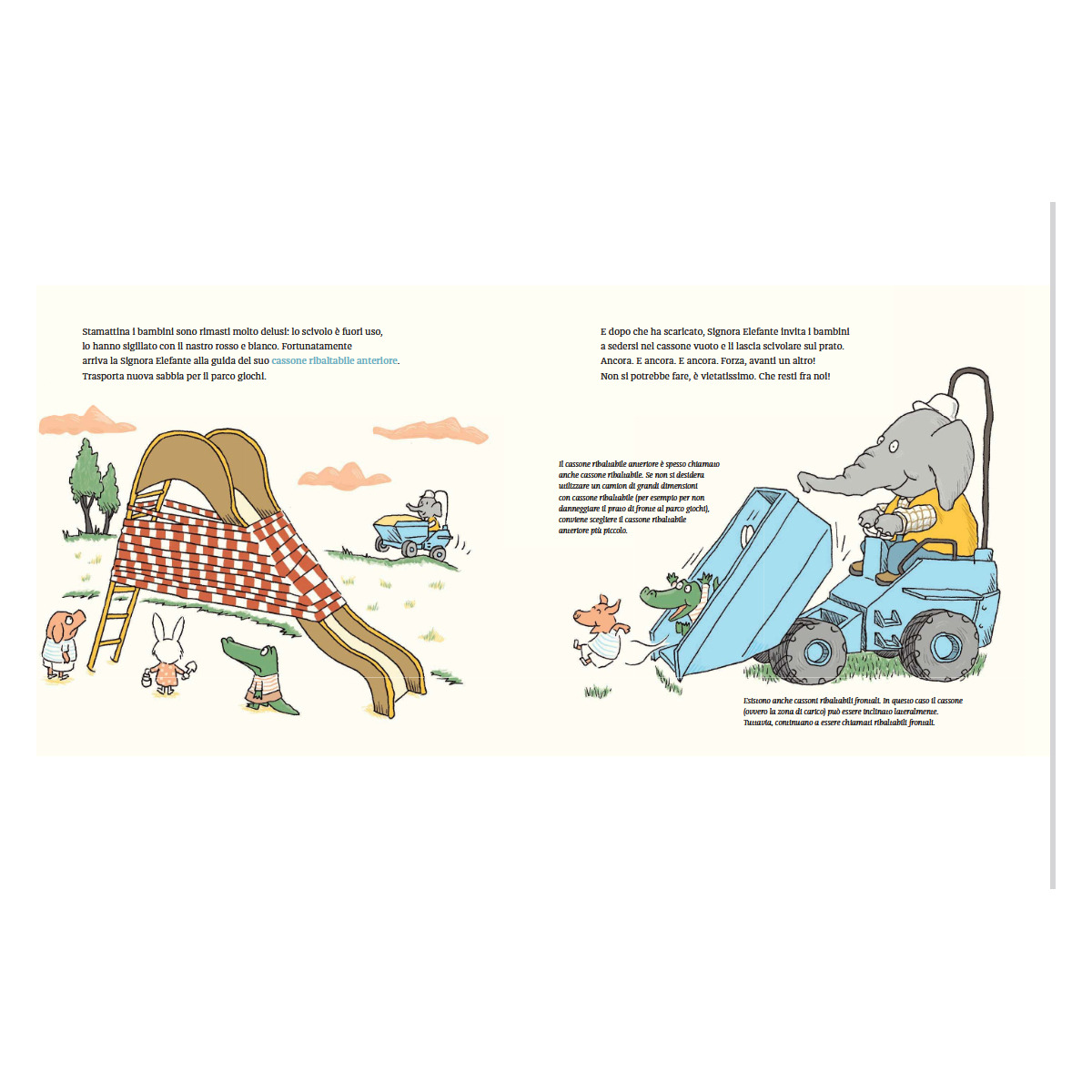 A guidarci ci sono personaggi decisamente insoliti: una pecora, un lupo, una gallina… tutti sorprendentemente esperti nell’uso di queste gigantesche macchine. E tra una scena e l’altra, spuntano informazioni buffe e inaspettate che fanno sorridere anche i grandi (sì, anche quella delle migliaia di uova nella betoniera).