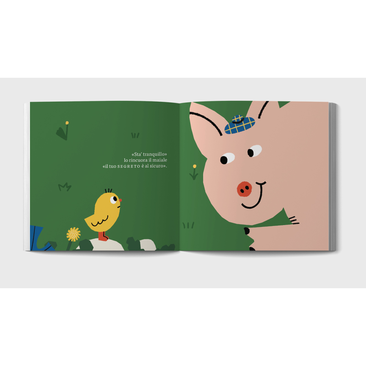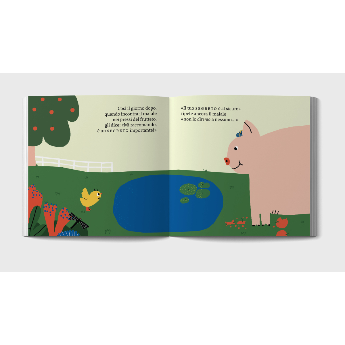 In fattoria c’è qualcosa che tutti hanno sulla punta della lingua: il segreto di Pulcino. Prima lo confida al maiale, poi il maiale lo dice a un amico, che a sua volta… be’, la voce corre veloce! Questa storia a catena gioca con il passaparola e mostra, con ironia e ritmo, come un “segreto importante” possa diventare di pubblico dominio in un battito d’ali. Le illustrazioni essenziali e il testo giocoso invitano bambini e adulti a riflettere su fiducia, rispetto e responsabilità: quando raccontare, quando tacere e come gestire la curiosità. Perfetto per la lettura ad alta voce, questo albo trasforma il meccanismo del segreto in un racconto comico e intelligente, con un finale che fa sorridere grandi e piccoli.