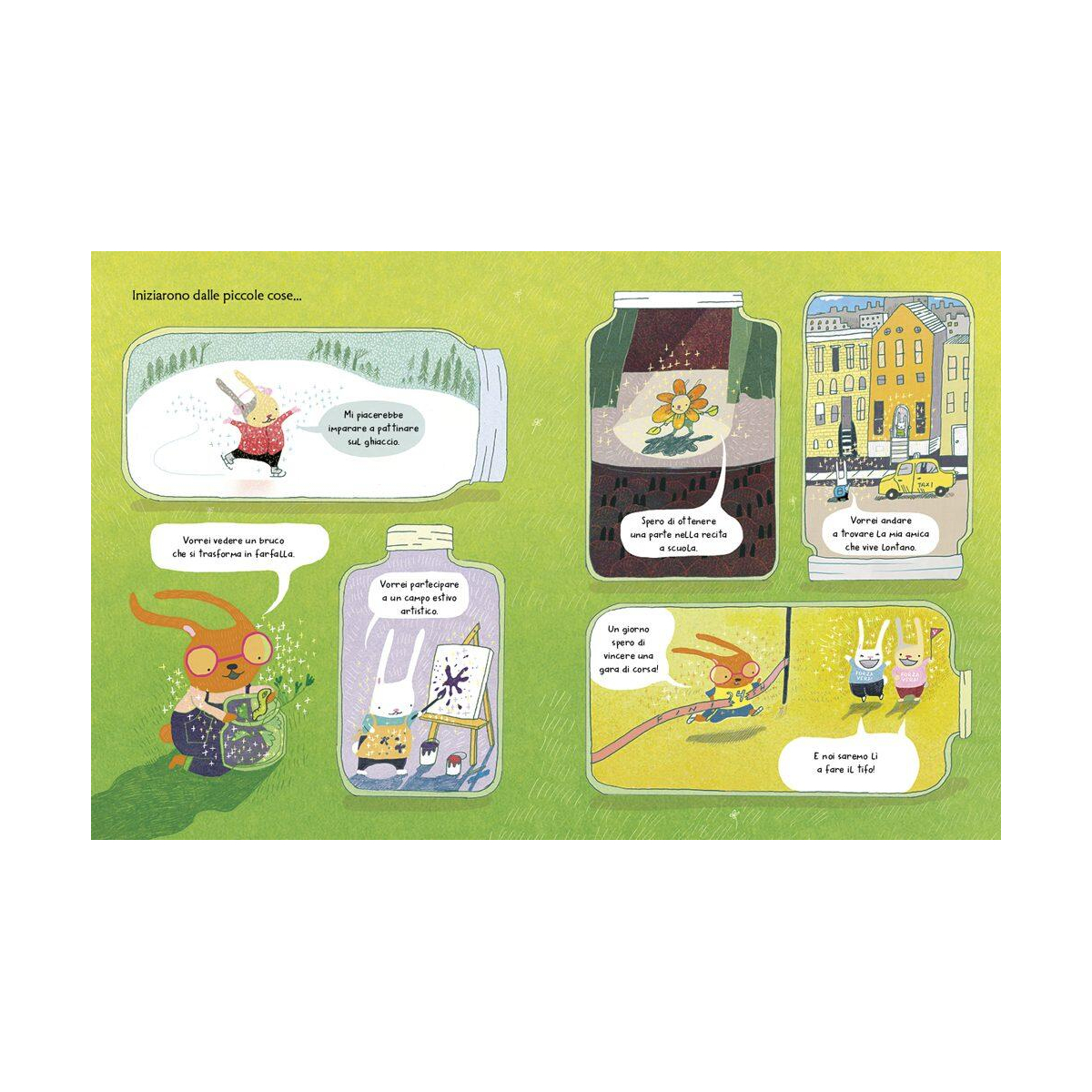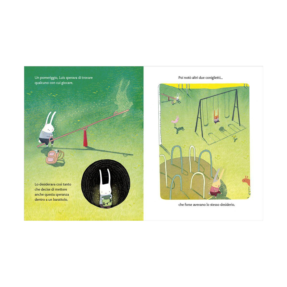 Per chi ha già amato “Un barattolo di stelle”, e “Un barattolo di emozioni”, un nuovo albo di Deborah Marcero, con il coniglietto Luis come protagonista. Luis e i suoi amici collezionano sogni. Li mettono in barattoli grandi e piccoli, in attesa di realizzarli. Così ne raccolgono tantissimi: pattinare sul ghiaccio, vedere un bruco che si trasforma in farfalla, recitare, andare sulla Luna. Ma come si fa a sperare ancora, se una tempesta all’improvviso arriva e spazza via tutti i barattoli, con il loro prezioso e vitale contenuto?