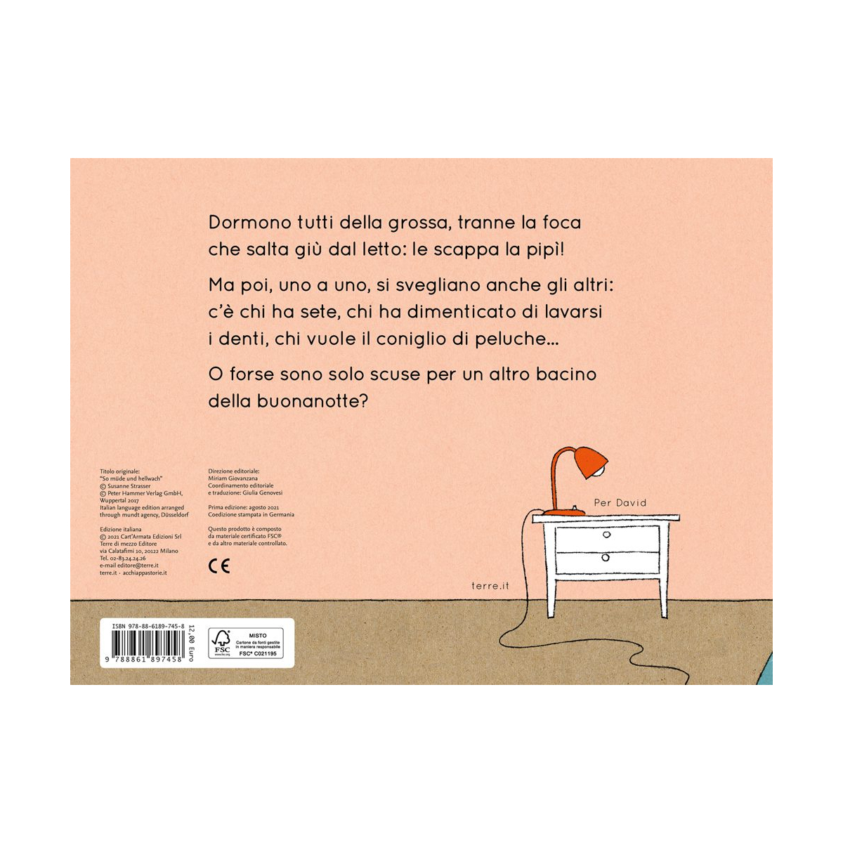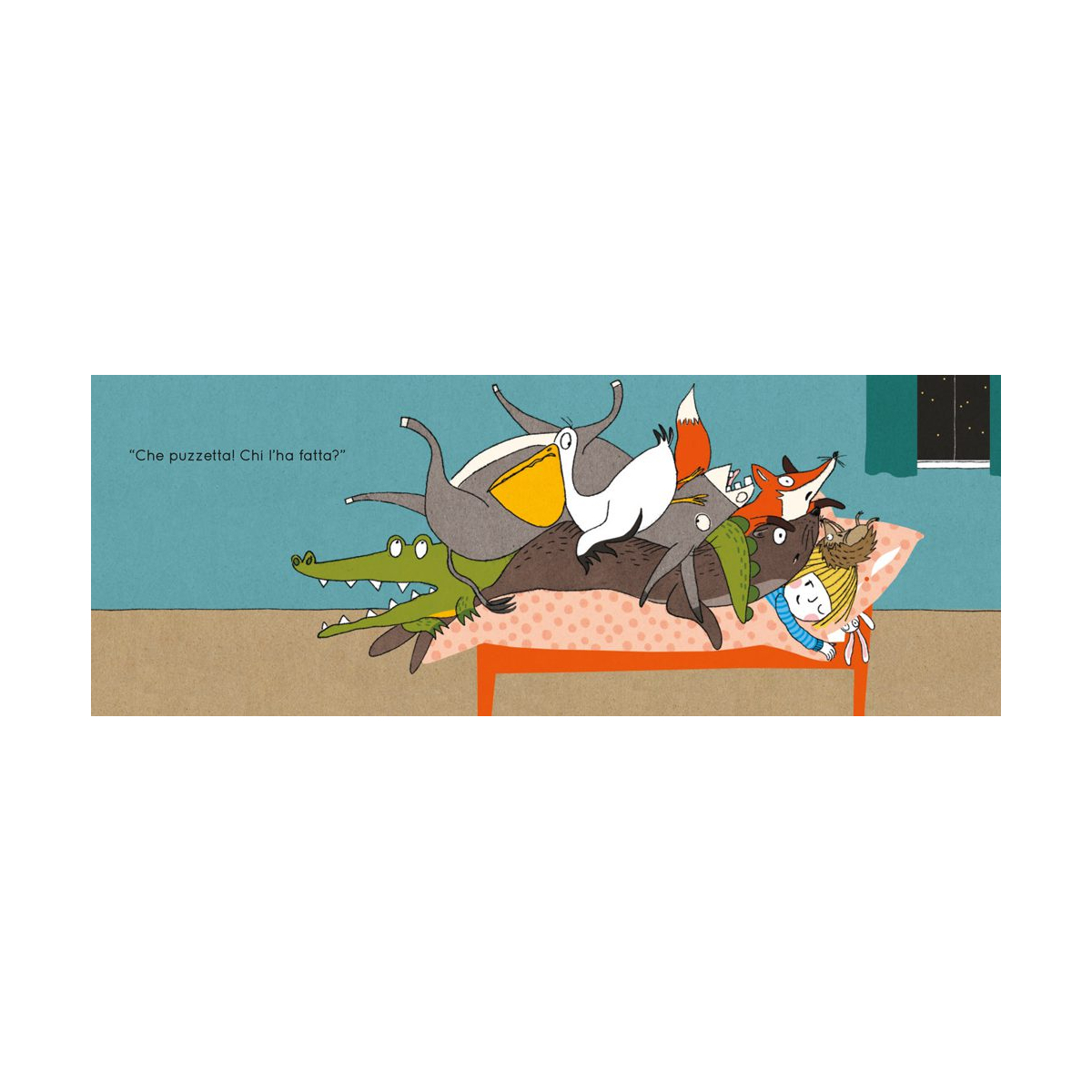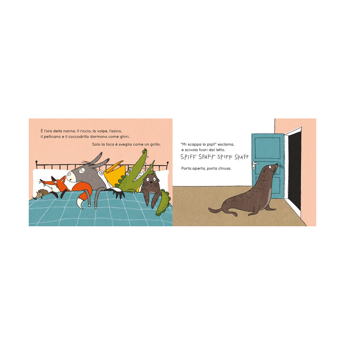 Tutti dormono, o almeno così sembra. Nella stanza è calato il silenzio, ma la foca è ancora sveglia: le scappa la pipì. Scende dal letto e sgattaiola fuori. Poco dopo, però, anche gli altri animali si svegliano: c’è chi ha sete, chi si è dimenticato di lavarsi i denti, chi non trova il suo coniglio di peluche. Uno alla volta, con motivazioni molto serie (a loro dire), si dirigono verso la stessa meta. E qual è? Il lettone del cucciolo d’uomo. Quando anche lui si ritrova circondato da un’improbabile compagnia notturna, la notte prende una piega decisamente movimentata. Con ritmo incalzante e illustrazioni essenziali e ironiche, questa storia accompagna il momento della nanna con leggerezza, trasformando piccoli rituali e richieste dell’ultimo minuto in un gioco condiviso.