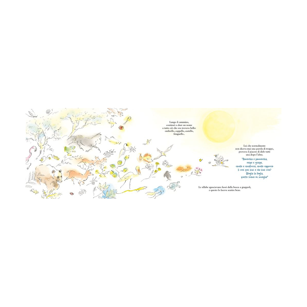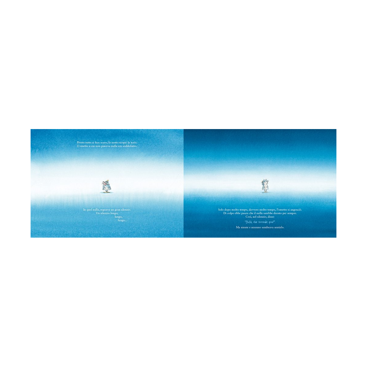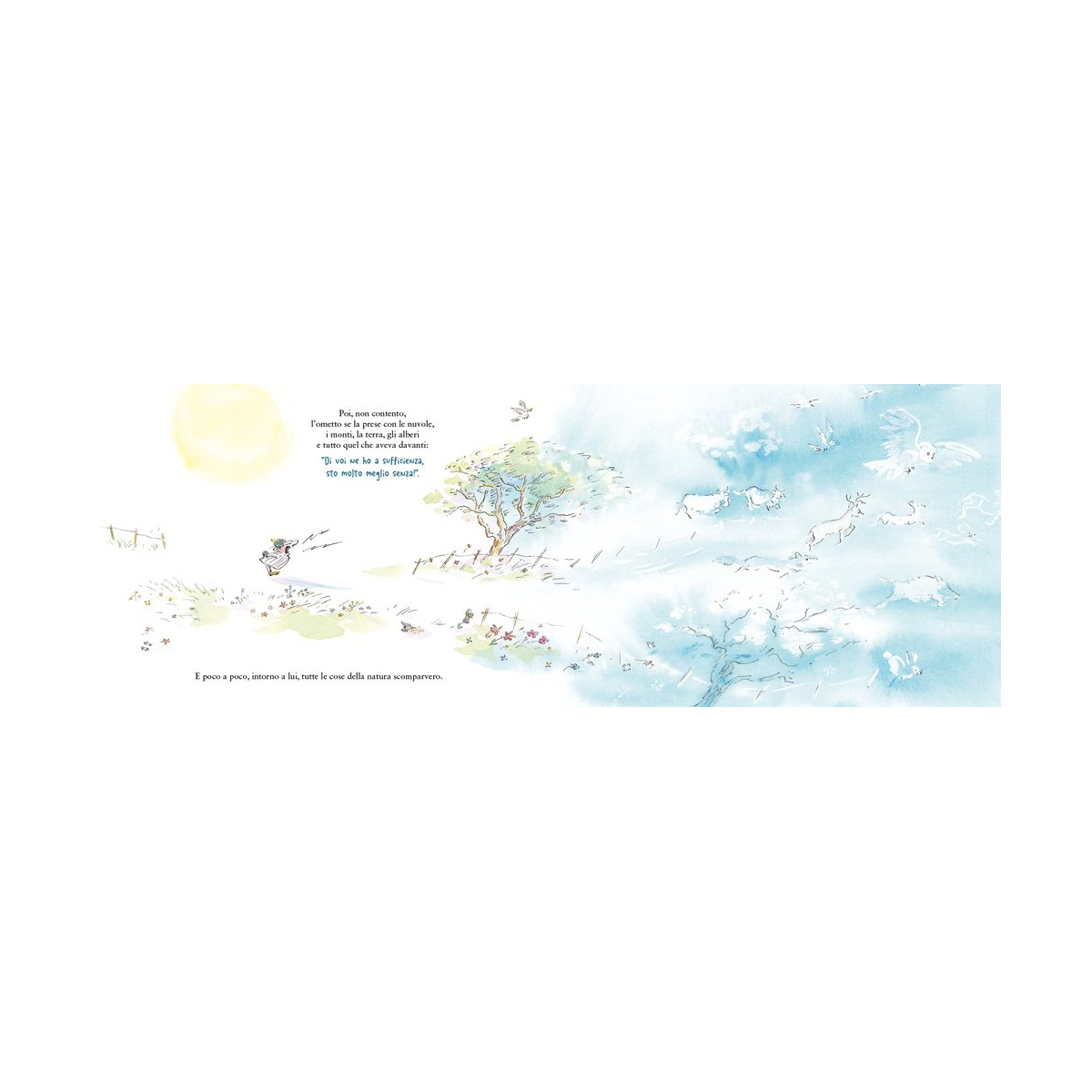C’è un ometto che non è mai contento. Brontola per ogni cosa: il cielo è troppo azzurro, l’erba troppo verde, gli animali troppo rumorosi. E a forza di lamentarsi, succede qualcosa di incredibile: tutto ciò che lo circonda comincia a sparire. Rimasto solo nel vuoto, senza alberi, senza stelle e senza vita, l’ometto capisce di aver esagerato. Vorrebbe tornare indietro, ma come si fa a far riapparire il mondo? Una vocina gli suggerisce la soluzione: deve nominarlo. Così, timidamente all’inizio e poi con sempre maggiore convinzione, l’ometto comincia a evocare ciò che aveva fatto svanire. E parola dopo parola, la realtà torna a brillare. Ispirato a una leggenda dei nativi americani, questo albo illustrato unisce ironia e poesia per raccontare il potere creativo del linguaggio e l’importanza di cambiare sguardo sulle cose.