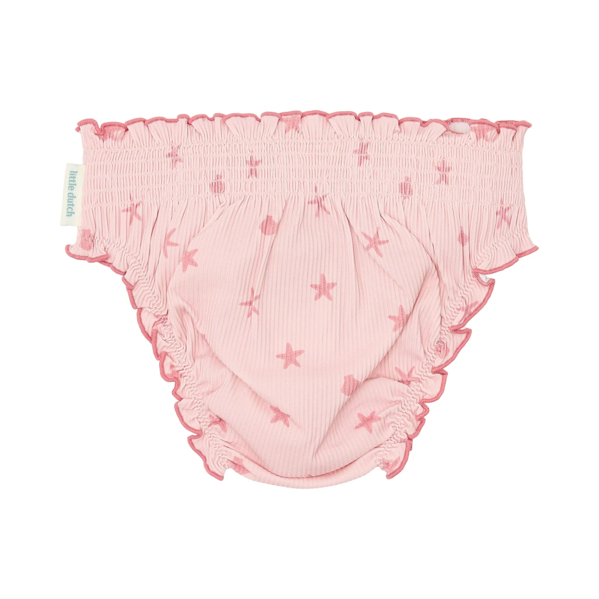 Lo slip costume per bambina è pensato per accompagnare le giornate estive tra acqua, sole e giochi all’aperto con comfort e libertà di movimento. Realizzato in tessuto morbido ed elasticizzato, si adatta delicatamente al corpo seguendo ogni movimento senza costringere. Il design con stampa ispirata al mondo marino crea un’atmosfera leggera e giocosa, mentre le ruches lungo i bordi aggiungono un dettaglio dolce e dinamico. L’elastico distribuito su tutto il bordo garantisce una vestibilità stabile e confortevole, ideale per tuffi, corse e momenti di gioco. Perfetto da indossare al mare, in piscina o in giardino, è un capo pratico e curato, pensato per accompagnare i più piccoli nelle loro prime esperienze estive.