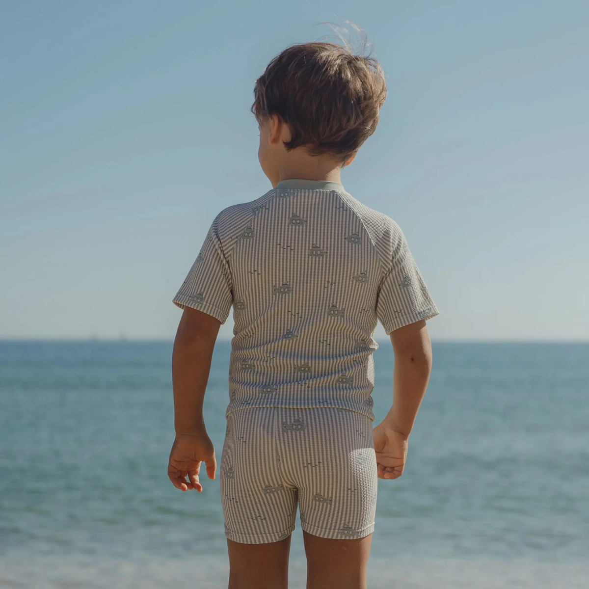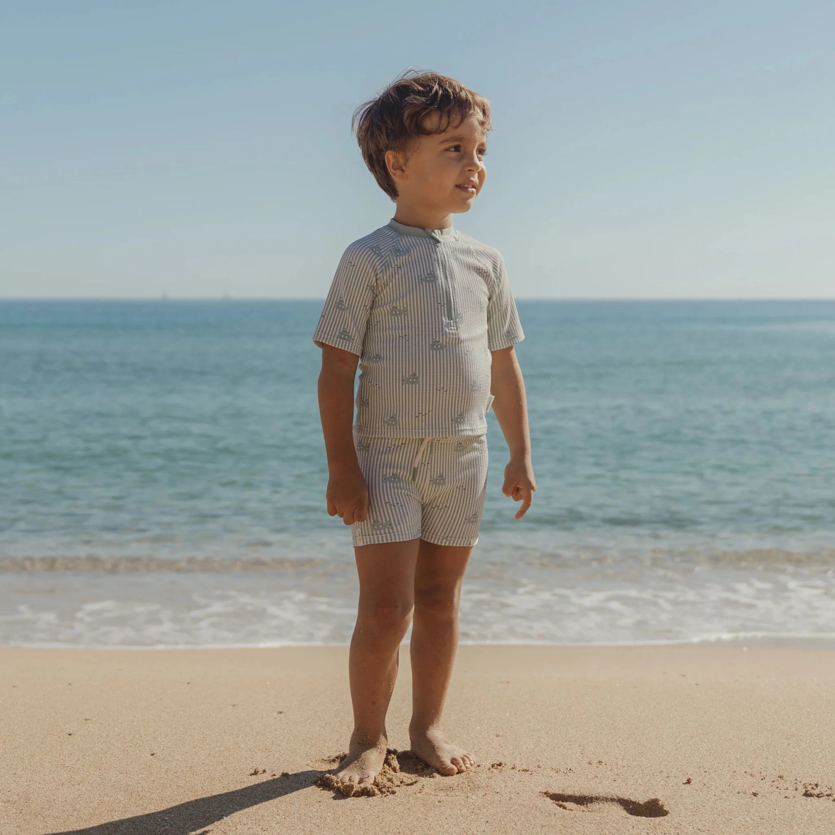 Il completo mare due pezzi è pensato per accompagnare i bambini nelle giornate estive tra acqua, sole e movimento continuo. Composto da maglia a mezza manica e pantaloncino coordinato, offre comfort e libertà durante ogni attività, dalla spiaggia alla piscina. La maglia è dotata di zip frontale, utile per indossarla facilmente anche quando è bagnata, e realizzata in tessuto waffle morbido ed elasticizzato che segue i movimenti senza costringere. Il tessuto con protezione UPF 40 aiuta a schermare la pelle durante l’esposizione al sole, rendendolo ideale per le lunghe giornate all’aperto. Il design ispirato al mondo marino aggiunge un tocco giocoso, rendendo questo set perfetto per i piccoli esploratori. Una soluzione pratica e completa per vivere l’estate con comfort e funzionalità.